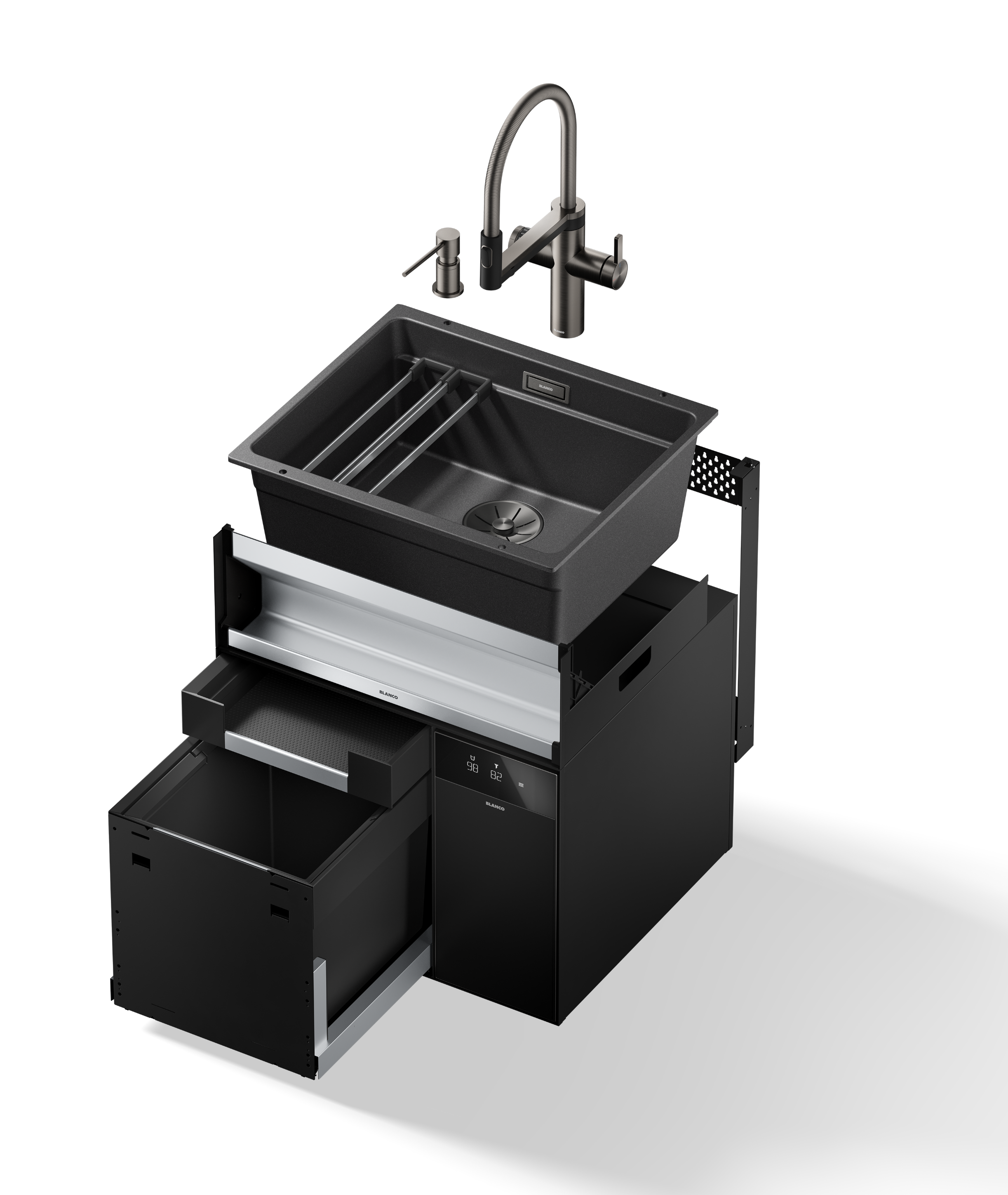 BLANCO Design-Highlight – verkörpert durch eine perfekt aufeinander abgestimmte BLANCO UNIT, bestehend aus DRINK.SYSTEM CHOICE LUNEOO-S, Spüle OOVALON und Abfallsystem FLEXON.